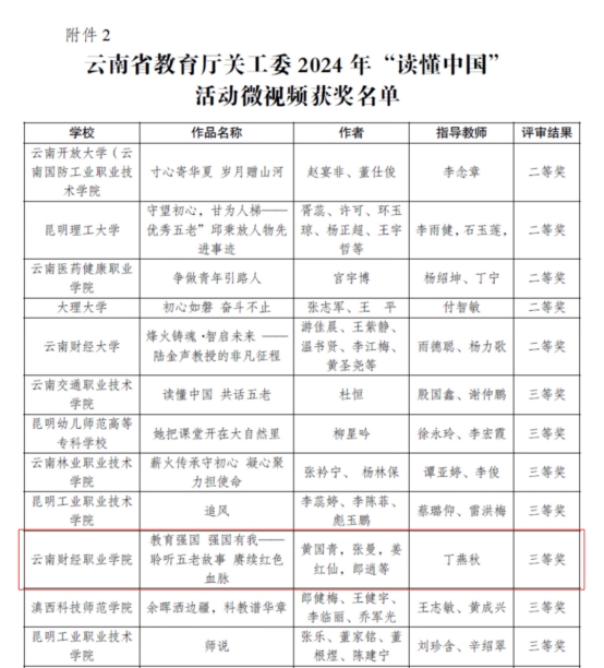 会上,云南省教育厅关工委常务副主任刘沧山宣读《云南省教育厅关工委关于公布2024年“读懂中国”活动评审结果的通知》。我校推选的作品《教育强国强国有我——聆听五老故事 赓续红色血脉》在“读懂中国”活动微视频中获三等奖。