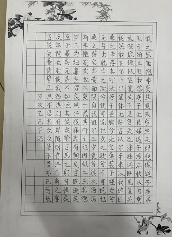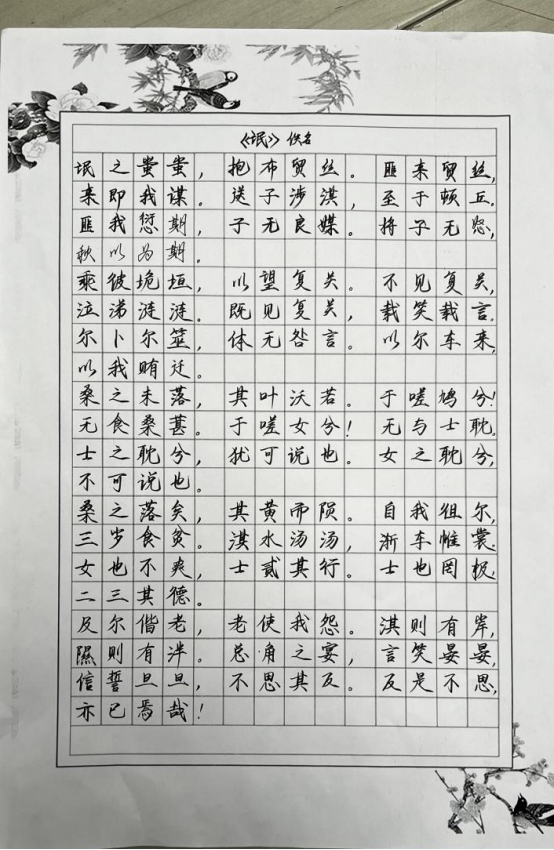 在硬笔书法赛道,同学们围绕“中国经典文学篇章”挥毫泼墨。他们刚劲有力的书写着《氓》等经典作品。