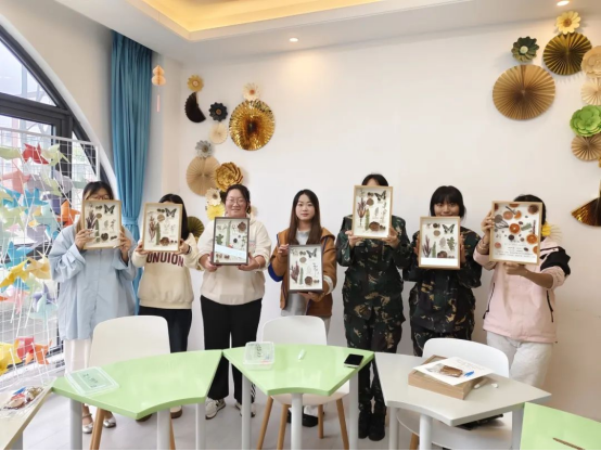 在干花标本创作教学环节,老师从色彩搭配原理、构图美学技巧等维度进行悉心指导。同学们手持形态各异的干花材料,发挥创意巧思精心设计,将个人审美意趣与内心情感倾注于作品之中,在修剪、拼贴、定型的过程中沉浸式感受