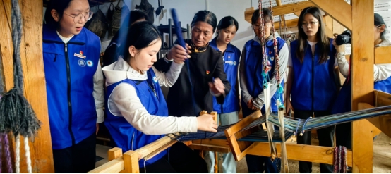 7月7日,实践团来到泸沽湖畔非遗博物馆,在30余年党龄的非遗传承人阿七独支玛指导下体验传统纺织技艺,身着摩梭服饰感受民族文化魅力,理解“各美其美,美美与共”的文化理念。