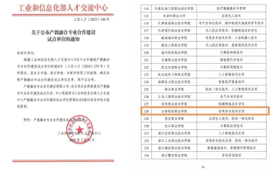 近日,工业和信息化部人才交流中心公布了2025年产教融合专业合作建设试点单位名单,云南财经职业学院成功入选,成为云南省两个入选单位之一。此次入选是对我校专业建设质量、校企合作深度及服务产业能力的认可,标志着我校在推动教育链、人才链与产业链、创新链“四链融合”的征程上迈出的坚实脚步。