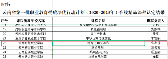 我校宋亦佳老师牵头制作申报的《财经应用文写作》在线课程通过云南省第一批职业教育提质培优行动计划(2020-2023年)在线精品课程认定,成为云南省职业教育提质培优行动计划首批在线精品课程。