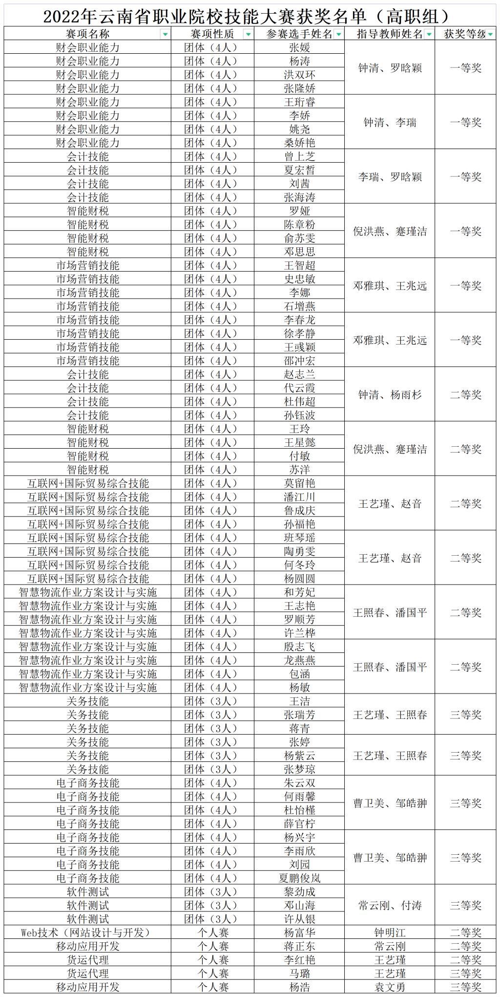 我校在2022年云南省职业院校技能大赛中荣获佳绩,分别荣获高职组团体一等奖6项,二等奖6项,三等奖5项;个人赛二等奖3项,三等奖2项,其中“会计技能”赛项实现六连冠。