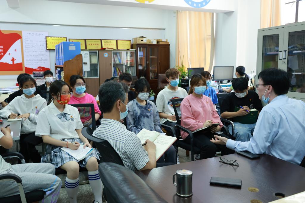 2022年4月27日中午,我校组织各级团学组织、学生社团对习近平总书记赴中国人民大学考察调研的重要讲话进行学习并以团支部为单位展开讨论,学校党委书记张金甫、党委副书记仲新来到校团委学生会办公室,带领校团委全体教师、第三届校学生会委员会全体成员共同进行了学习。