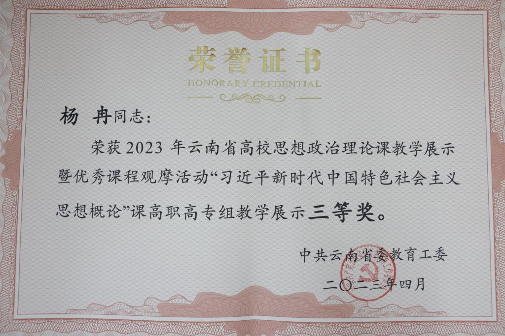 在今年3月举行的2023年云南省高校思想政治理论课教学展示暨优秀课程观摩活动中我校马克思主义学院思政课教师李凌、杨冉分别荣获毛泽东思想和中国特色社会主义理论体系概论课程(高职高专组)优秀奖和习近平新时代中国特色社会主义思想概论课程(高职高专组)三等奖,为学校争得了荣誉,展现了我校教师优良的精神风貌。