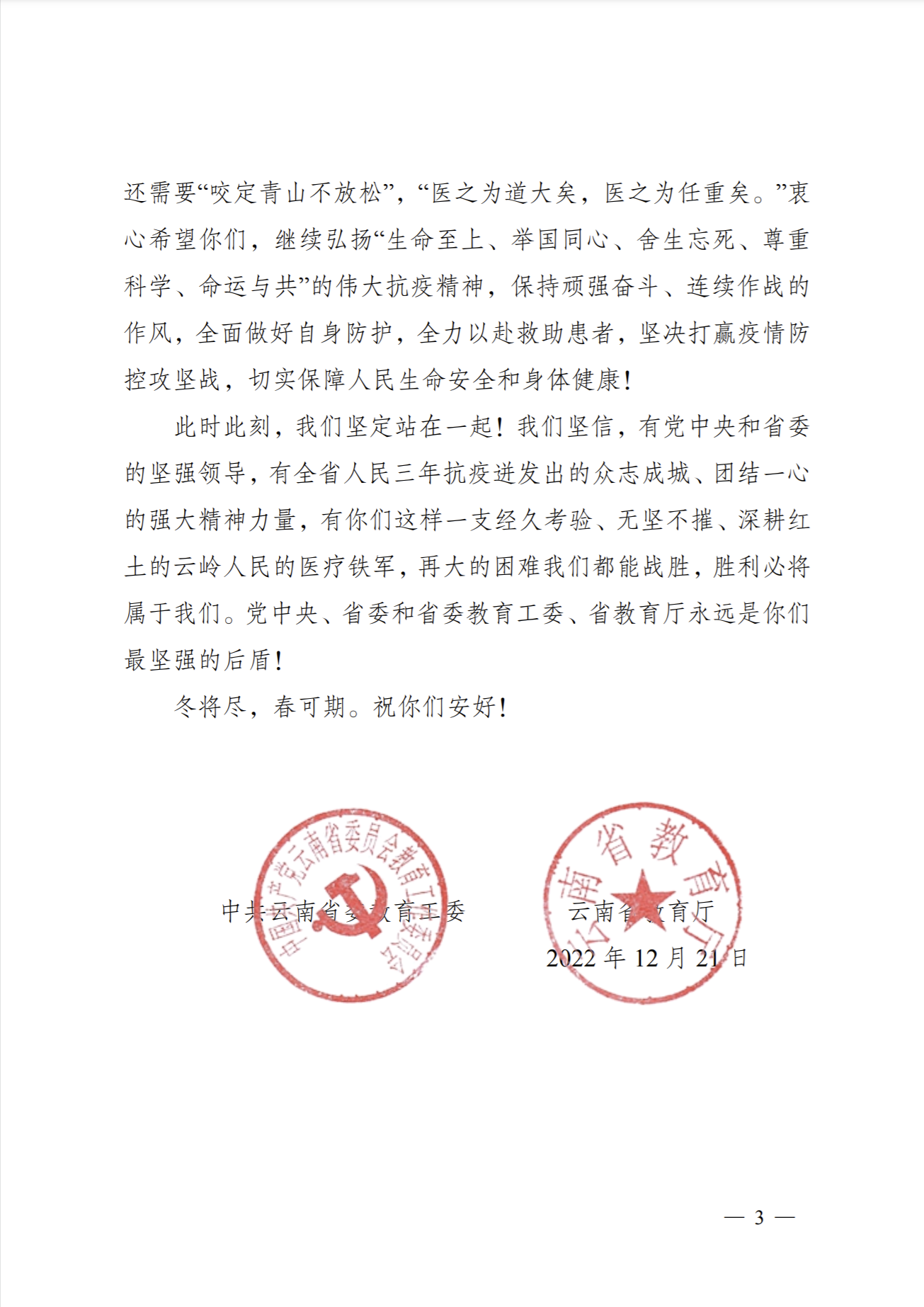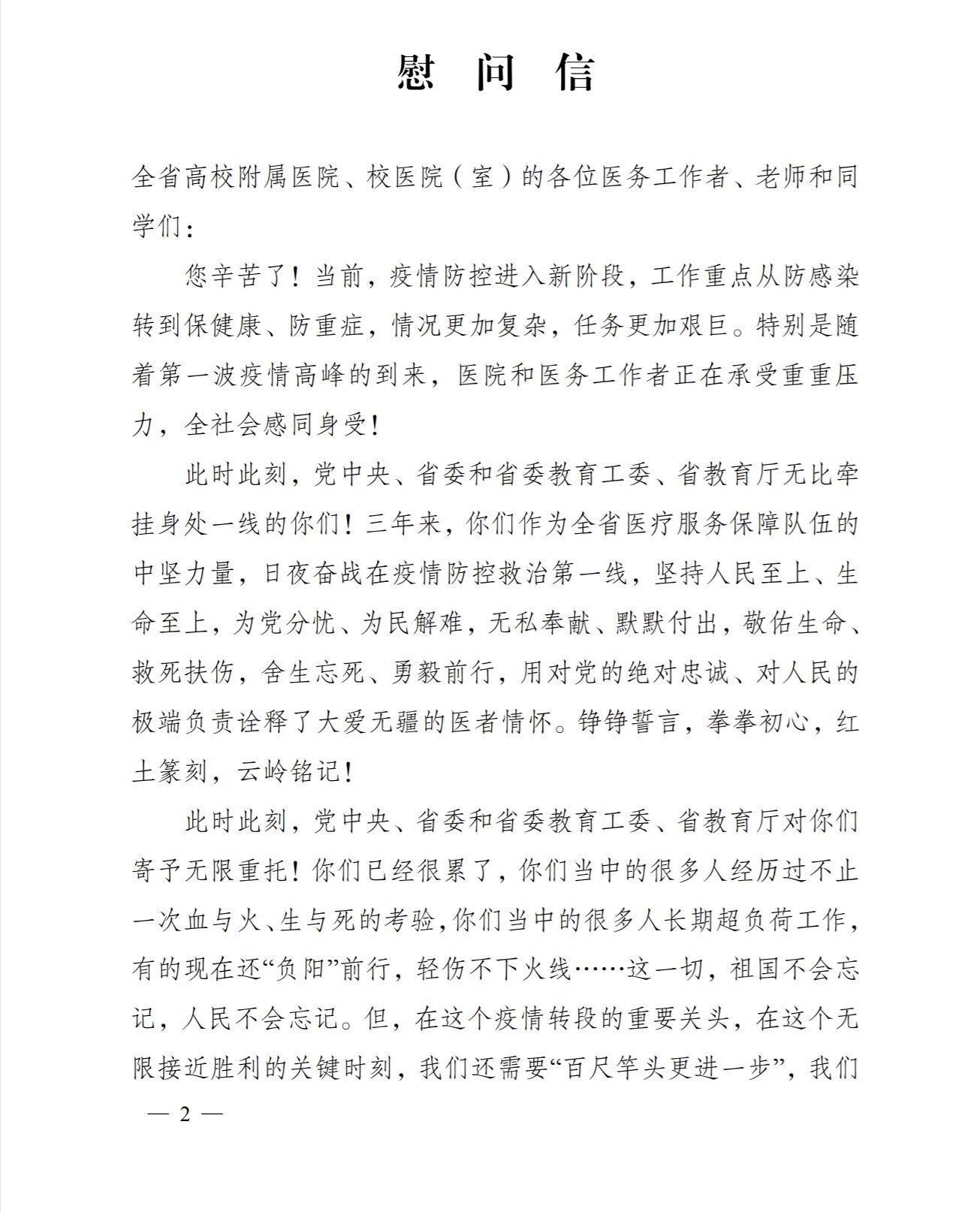 致全省高校附属医院校医院室医务工作者慰问信