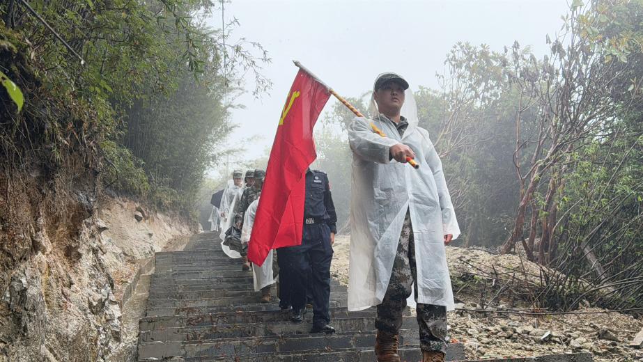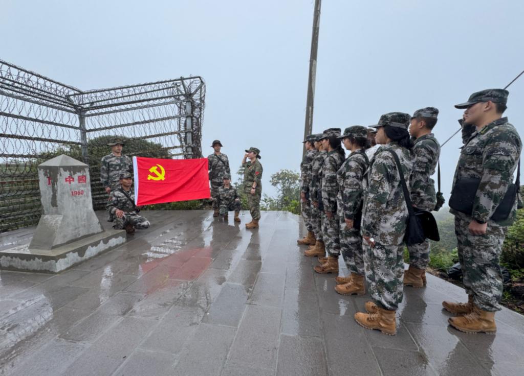 随后,全体成员肃立在界碑前,面向党旗,在风雨声中,庄严地举起右拳,一字一句,跟随老师清晰地重温入党誓词。铿锵的誓言,与界碑上殷红的“中国”相映,在山谷间回响。