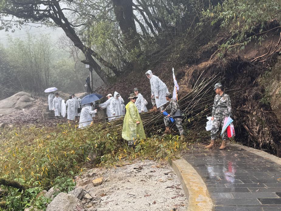 前往界碑的路途,直接考验着团队的意志与协作能力。因前方塌方导致车辆无法通行,实践团成员在戍边民警的带领下,毫不犹豫地徒步进入雨雾弥漫的林区。连绵雨水迅速浸透衣衫,湿滑崎岖的山路上,还遍布成片倒伏的竹群,行进阻力陡增。面对困难,“你累我拎、我累他扛”成了最实在的行动准则。队员们沾满泥泞的双手接力传递着沉重的物资包,见同伴脚步不稳时,总有援手及时伸出。无需过多言语,彼此扶持、共渡难关的默契已然形成。