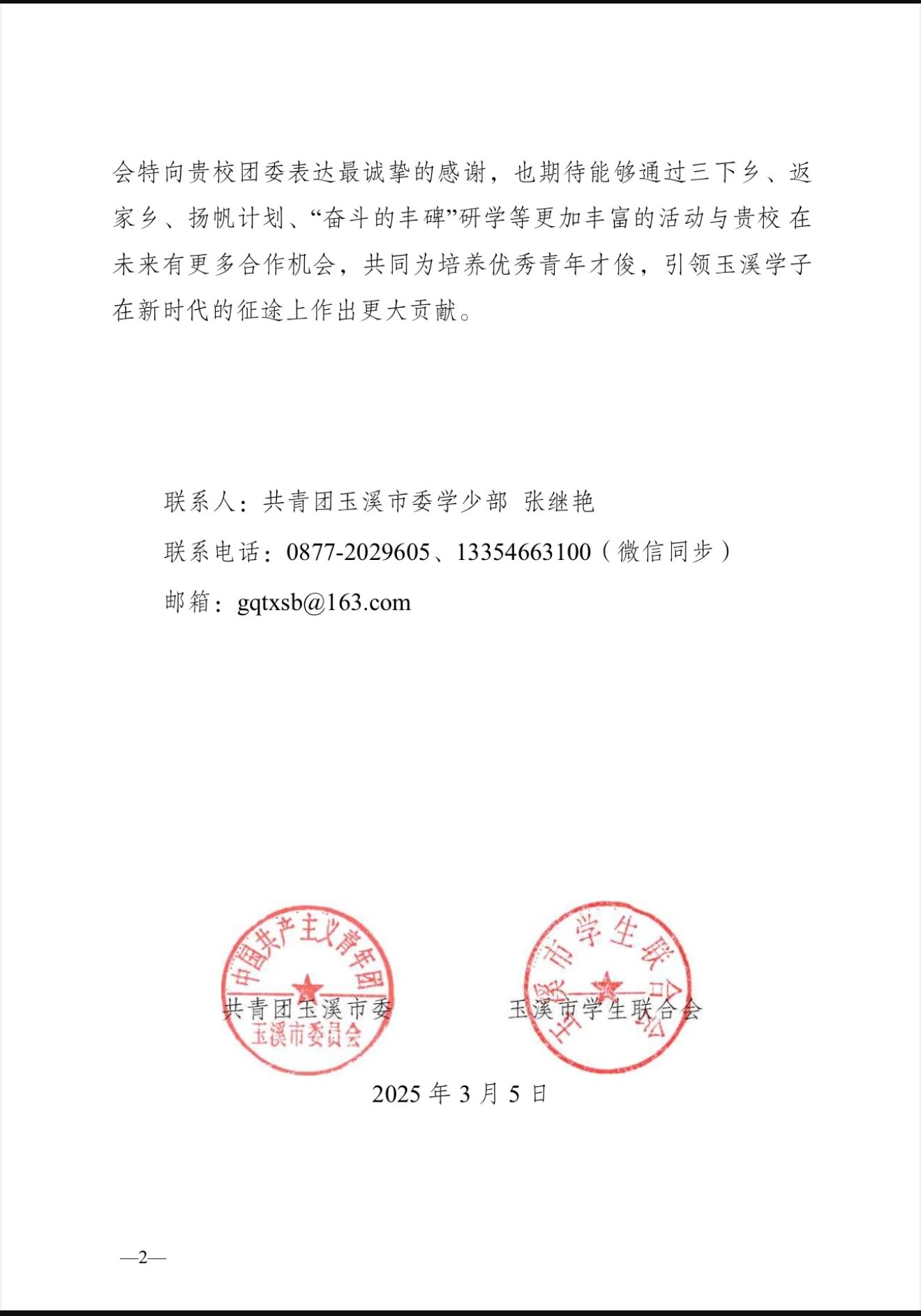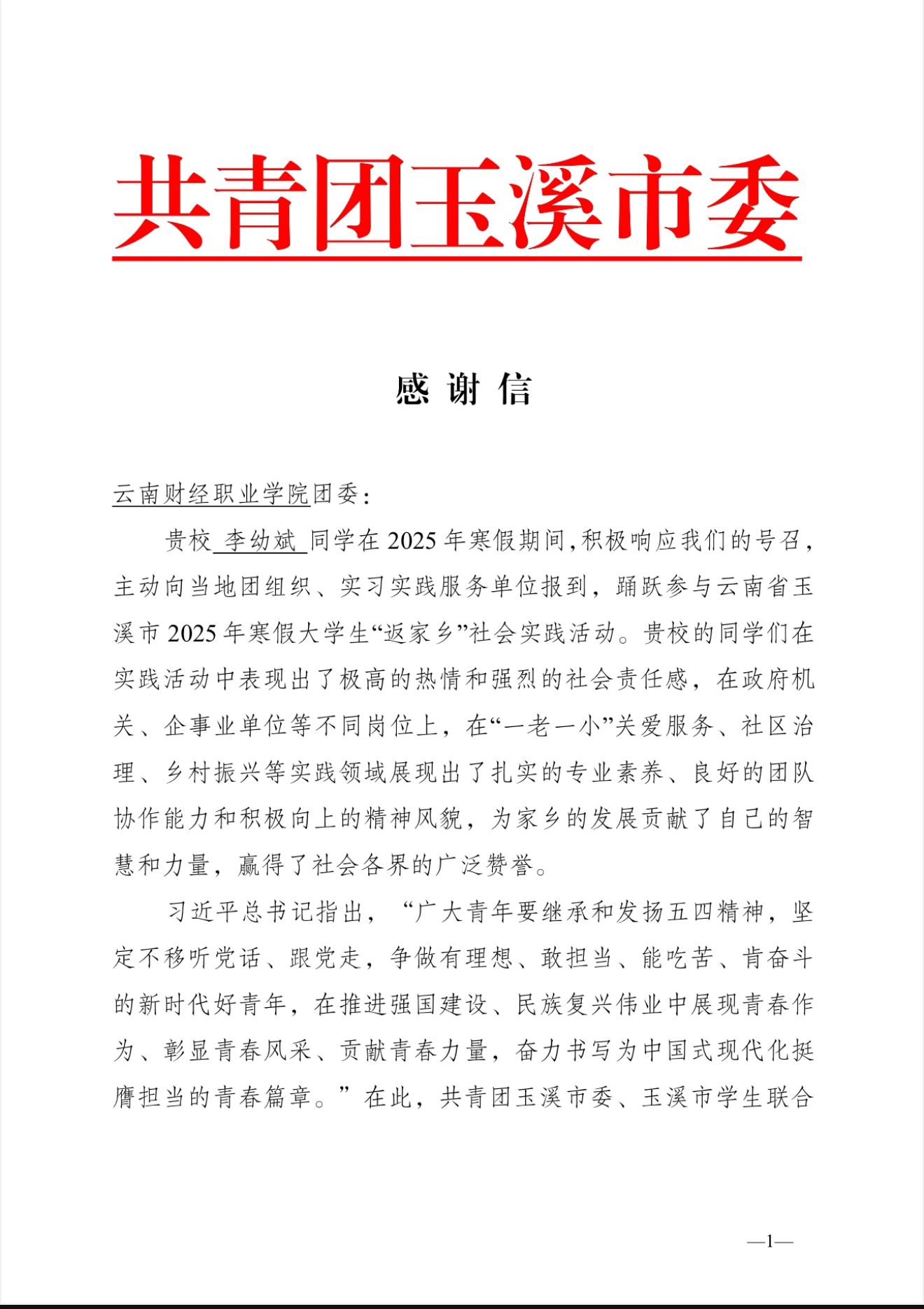 近日,我校团委收到了两封来自共青团玉溪市委及共青团华宁县委的感谢信。信中,共青团玉溪市委及华宁县委对我校李幼斌、李姝语、尤雯慧同学参加2025年大学生寒假“返家乡”社会实践活动中的优异表现表示了肯定与赞扬,对我校的支持表达了感谢。