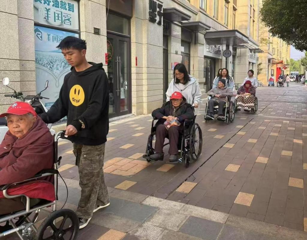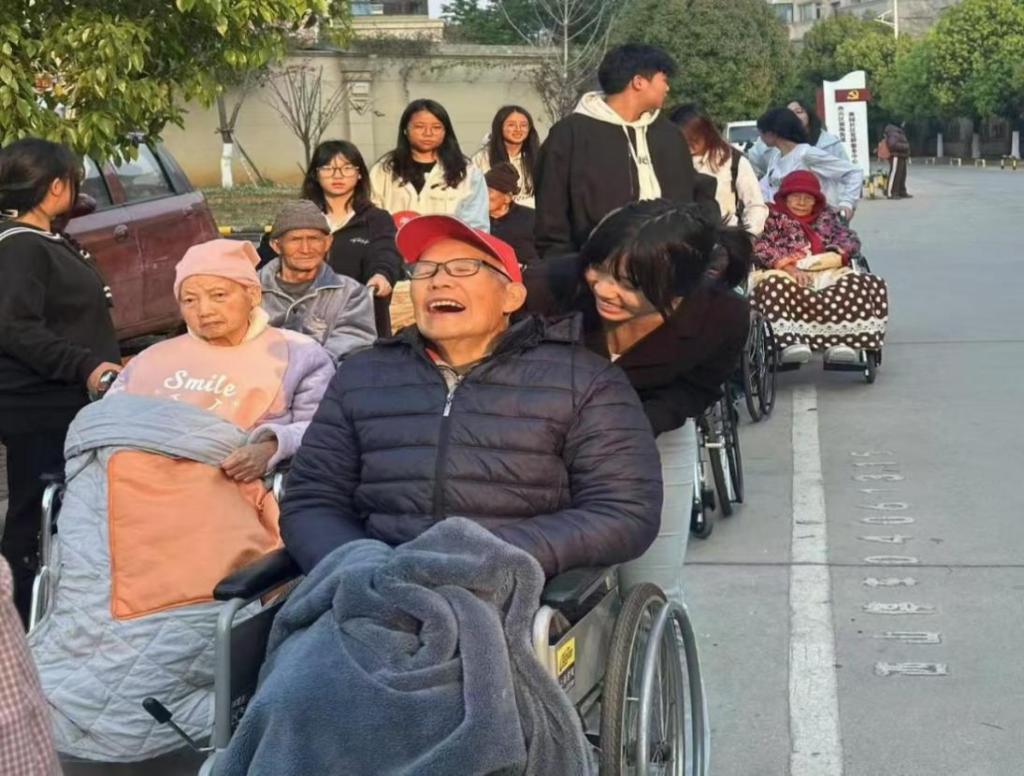 在缓缓的轮椅行进中,老人们的脸上洋溢着幸福的笑容。他们或是指点着路边的花草,或是回忆起往昔的故事,与年轻的志愿者们分享着生活的点滴,并纷纷对同学们的暖心举动表达诚挚的感谢。