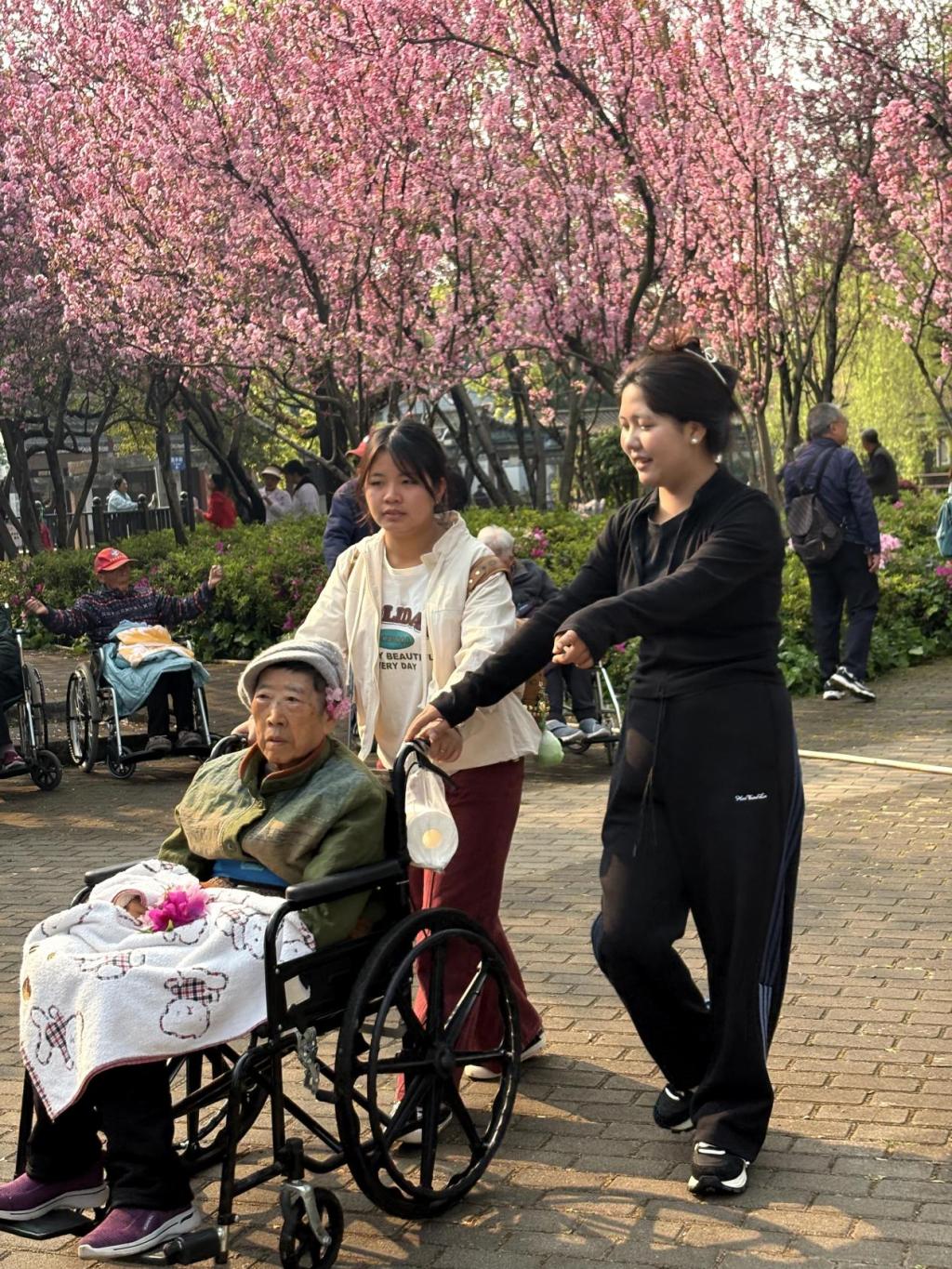 活动当天清晨,志愿者们早早抵达养老院,开展岗前培训,学习轮椅推行技巧、老年护理和应急救护知识。随后,志愿者们两两一组,将老人们推行至西华园,共赏春日美景。