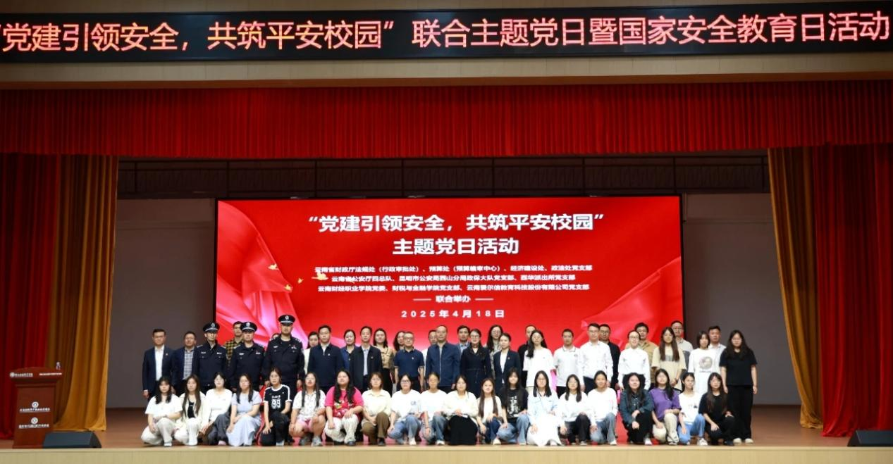 在第十个全民国家安全教育日到来之际,为强化国家安全观念普及国家安全知识增强师生防范意识2025年4月18日,云南省公安厅总队党支部昆明市公安局西山分局,西华派出所云南省财政厅法规处(行政审批处)、预算处(预算编审中心)、经济建设处、政法处党支部云南爱尔信教育科技股份有限公司党支部我校财税与金融学院党支部在大观校区联合开展“党建引领安全,共筑平安校园”主题党日活动党员代表、大观校区10个团支部学生和教师代表1000余人参加此次活动