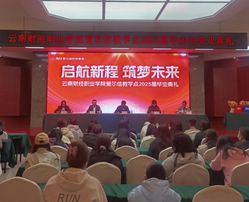 2025年3月16日上午,云南财经职业学院高等学历继续教育2025届毕业典礼在校外教学点爱尔信总部二楼报告厅举行,本次毕业典礼采用线上加线下的形式同步进行。学校副校长李雄、继续教育学院负责人、爱尔信集团执行总裁、  爱尔信产业学院校长余强、爱尔信股份财税教育副校长刘金花及383名毕业生参加本次典礼。