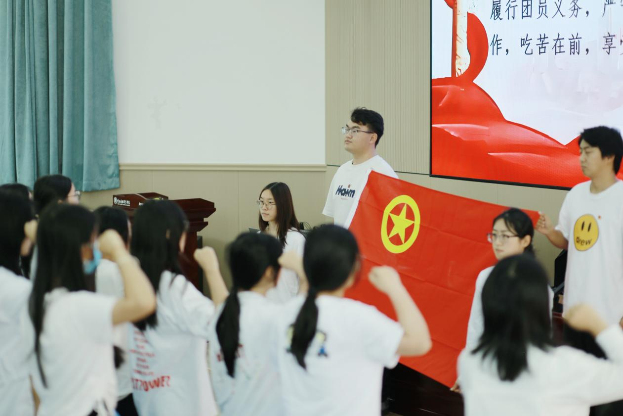 仪式上,宣读了新团员名单、全体团员共同面向团旗庄严宣誓,财税与金融学院党支部书记和团总支书记为新团员代表佩戴团徽。