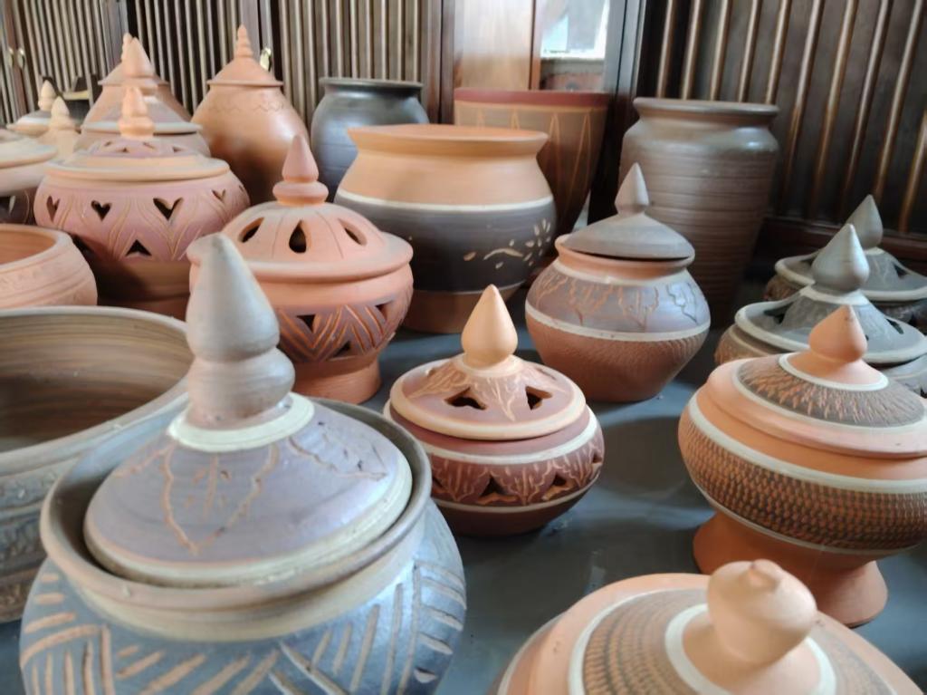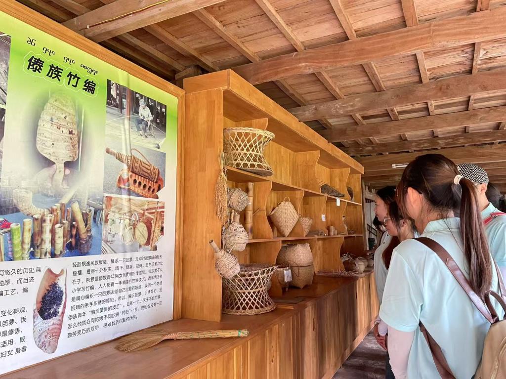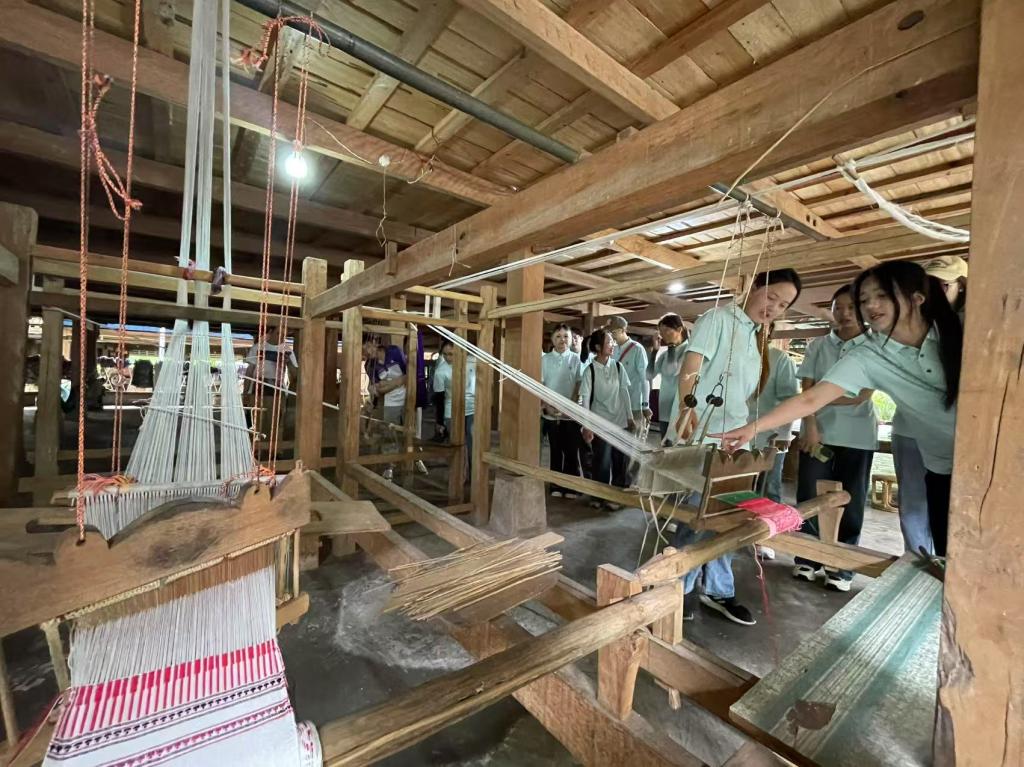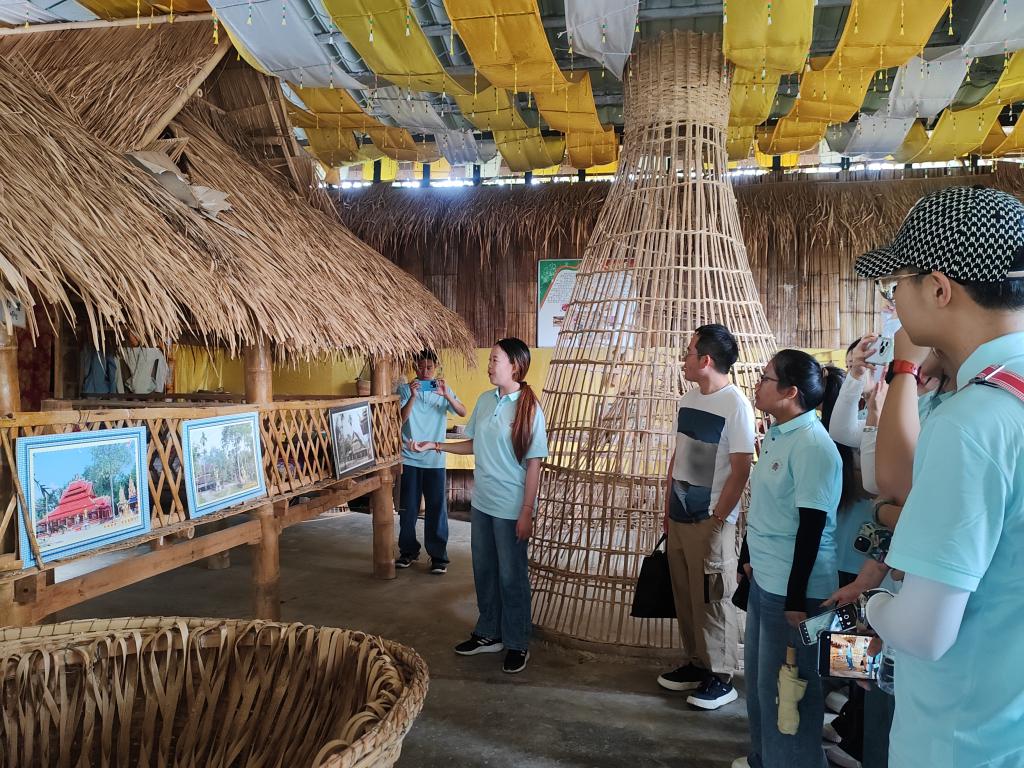 上午9时,团队在勐腊县教体局工作人员的引导下走进曼龙勒村,开启傣族文化探源之旅。队员们参观了传统干栏式民居,观摩傣族织锦、竹编、慢轮制陶等非遗技艺,并与非遗传承人交流,了解文化保护现状。