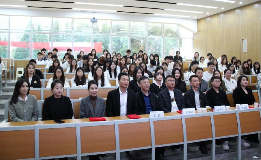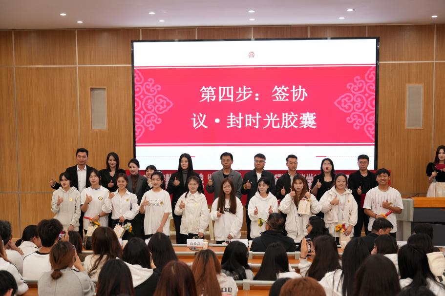 在本次活动的核心环节拜师仪式上,10位来自企业一线的导师,接过学徒代表精心制作的电商元素拜师帖,学徒代表给师傅们鞠躬敬茶,导师们则微笑着回赠徒贴,并为学徒佩戴上象征着责任的传递与使命延续的校企标志徽章,师徒间共同签订了师徒协议并封存在时光胶囊中,约定在学徒出师之日共同开启,用今日的承诺见证彼此的成长。宣誓环节,导师们郑重承诺“倾囊相授、悉心指导”,学徒们则立下“虚心求教、严守师训”的誓言。严肃而又有温情的拜师仪式,体现了传承的力量,感染了现场的每一个同学。