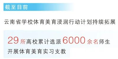 通过体育美育浸润行动计划,云南已从全省高校选派6000余名师生,定向帮扶薄弱地区中小学,积极参与受帮扶学校的体育、音乐、美术等学科教学,让乡村孩子也能享受到优质的体育美育教育,全面提升综合素质。