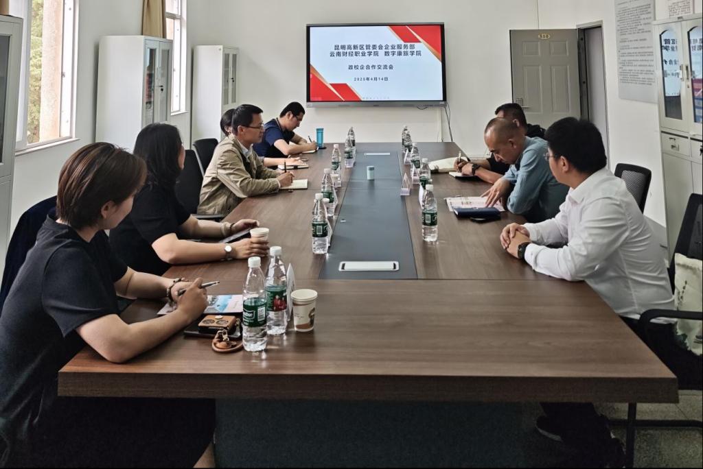 为加强产学研深度融合,促进健康管理专业人才培养与产业需求的精准对接,2025年4月14日下午,昆明市高新区管委会企业服务部与学校数字康旅学院就健康管理专业合作事宜进行了深入沟通交流。