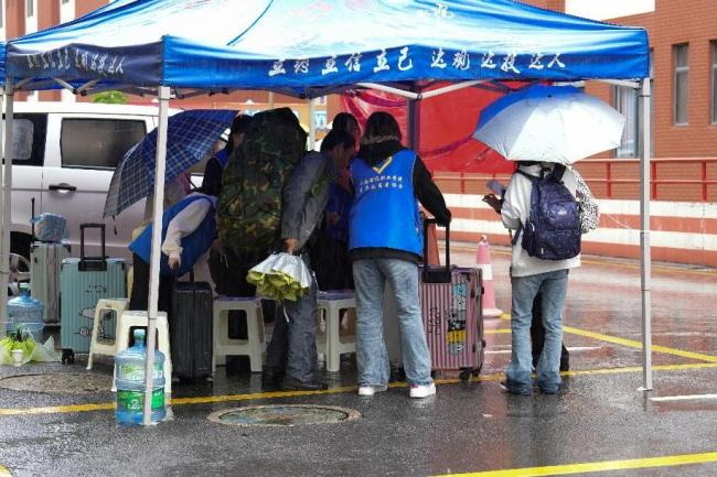 早晨,报到处“行李接应点”已有序运转,志愿者们趟过深浅不一的水洼,稳稳接过新生包裹,细心裹上防雨罩后便拎起箱子,“我带您去宿舍楼下,咱们从这边走,水少路好走”的指引声在雨雾中格外清晰。从报到处到宿舍楼的短短路程里,志愿者们撑伞全程陪同,既留意避开积水路段,又细致介绍楼内吹风机的安放位置、公共洗衣机的操作规范,就连宿舍楼下可供临时放置行李的角落、雨天取快递的便捷路径,都一一耐心告知。